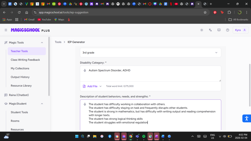 The draft attaches reasoning and examples to my prompt. For instance, I never said that they could explain logical steps verbally, nor did I say they had difficulty organizing ideas and maintaining conventions; AI made assumptions. They also assumed that the student’s challenges with emotional regulation are related to frustration and difficulty cooperating in groups.