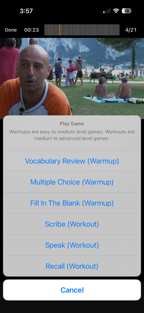 The learning games in Yabla use only the words used in the video. I do like that the games put into practice words that you have already seen and heard in context, but it does mean practicing a lot of words at once and it is not necessarily optimal if you are looking to only learn essential phrases for travel or a specific motivation.