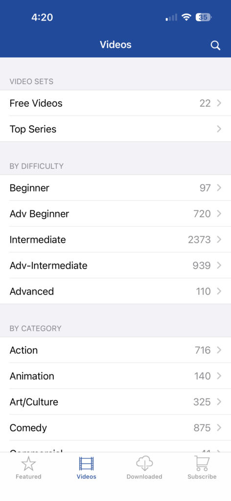 If you have the pro version, the videos are organized by difficulty and subject, which makes it really easy to find the video that is right for you. Unlike Duolingo, you do not need to complete the ten levels before going to the topic that interests you.